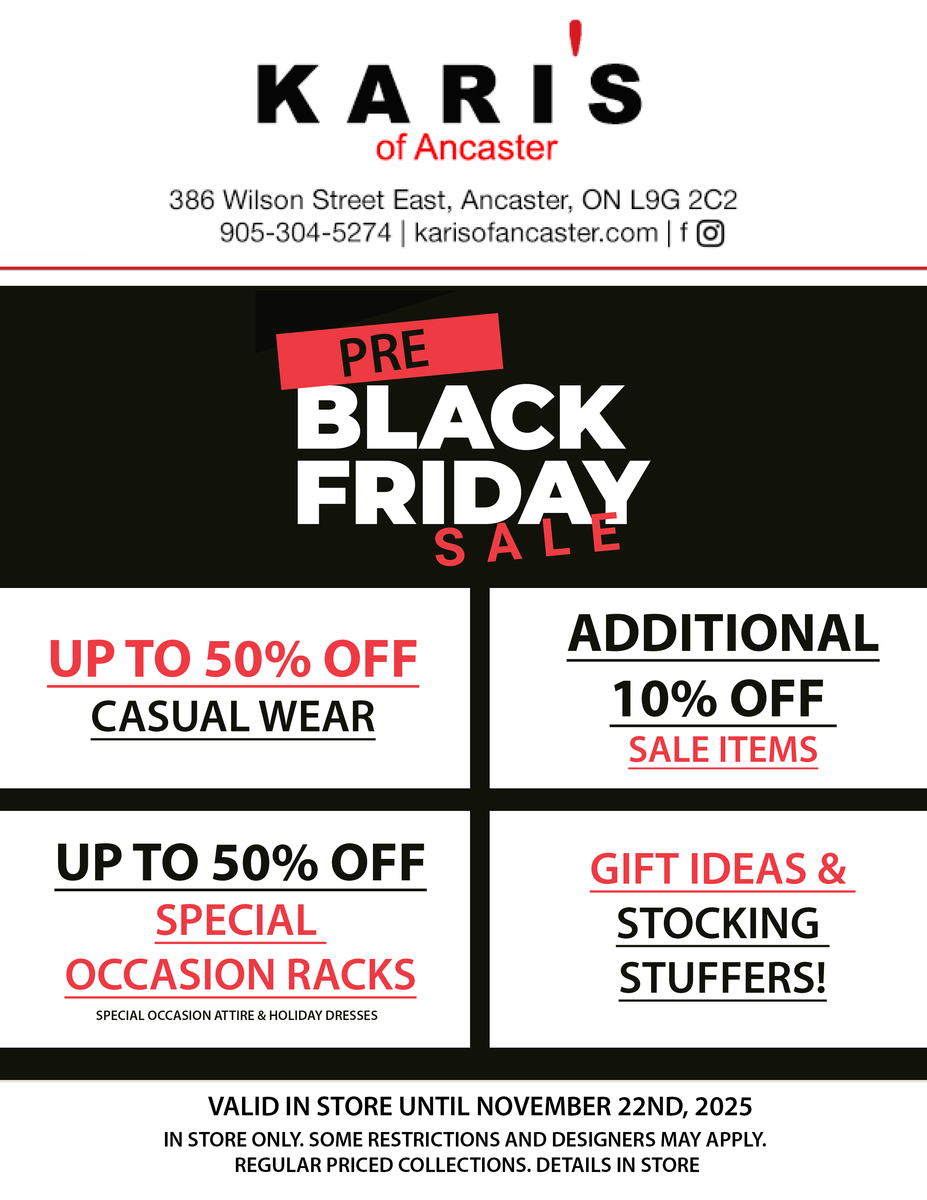 Kari's of Ancaster focuses on one-to-one personalized service. We continue to provide sophisticated and beautiful fashion to all women for over 19 years.