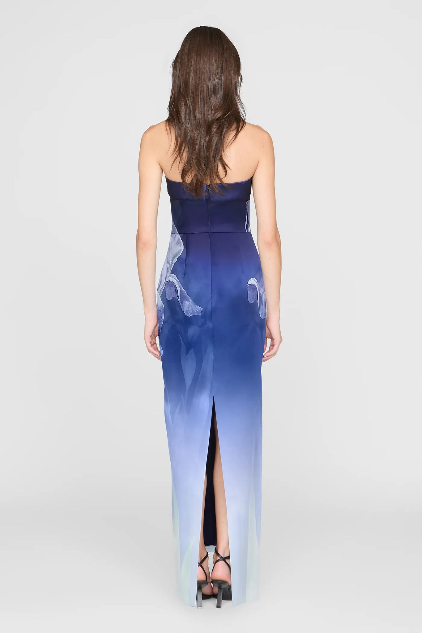 Mikado strapless column gown with a sleek neckline band and painterly florals inspired by Art Nouveau glasswork. Layered color and repeated angles add depth and a subtle glass-like effect. A signature silhouette for black-tie evenings and formal events.