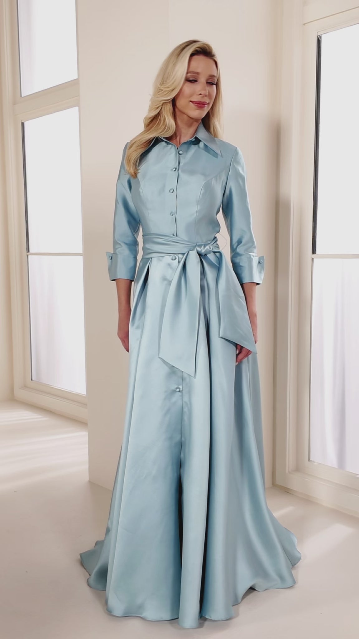 This refined A-line gown offers modest elegance with a classic collar, delicate button detailing, and graceful sleeves. Crafted from luxurious Mikado fabric, it features a coordinating belt that accentuates the natural waist for a timeless silhouette.