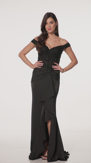 This stunning gown is a show-stopping choice for your special occasion. The off-the-shoulder sweetheart neckline is adorned with intricate lace and beadwork to elegantly highlight the décolletage. The fitted bodice cinches the waist, while the draped satin skirt cascades into a dramatic, ruffled slit, to create breathtaking movement.