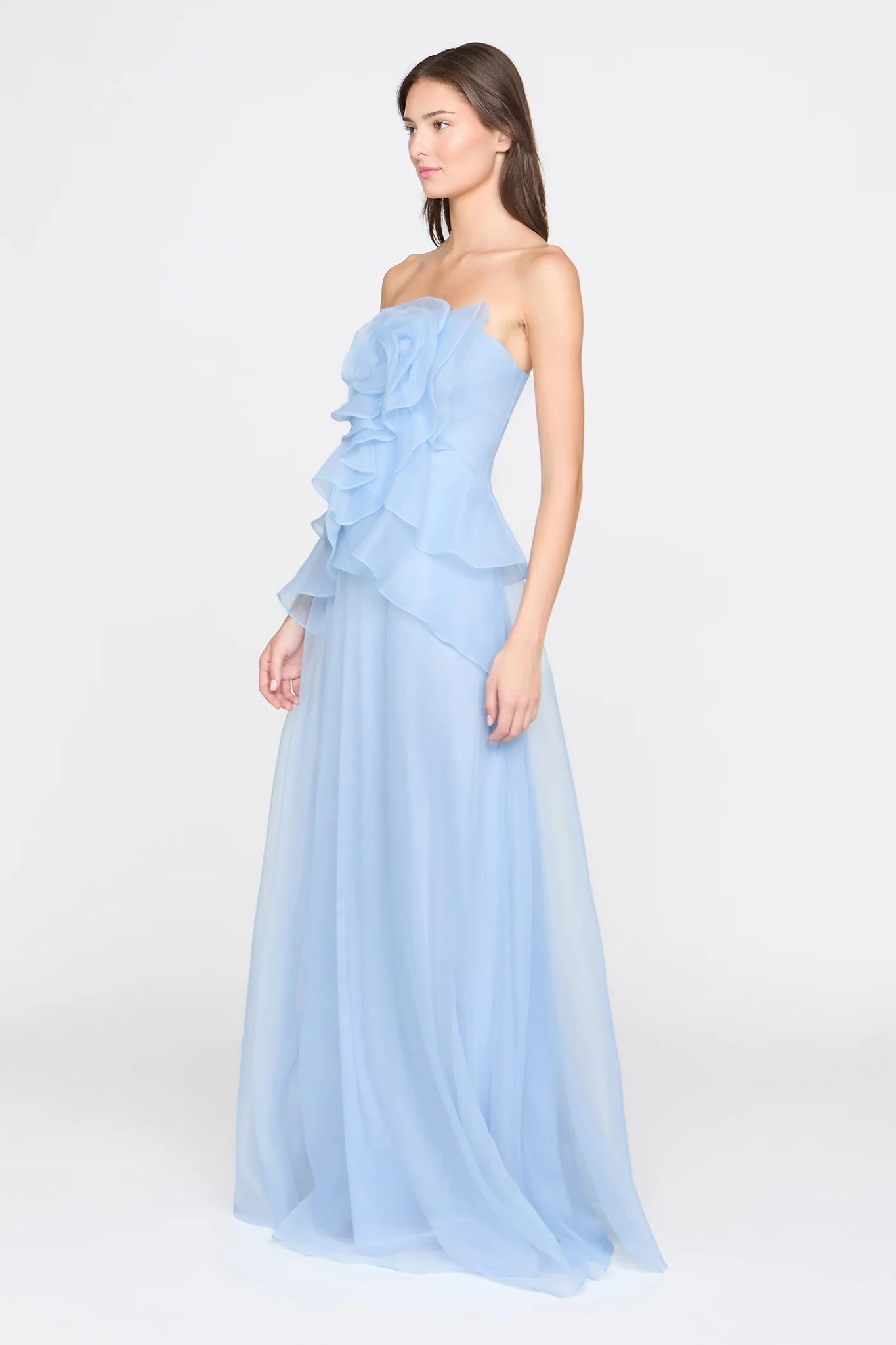 Pebbled organza gown in serenity blue, sculpted with layered draping that forms a soft floral shape across the bodice. A luminous choice for black-tie evenings, galas, and formal celebrations.