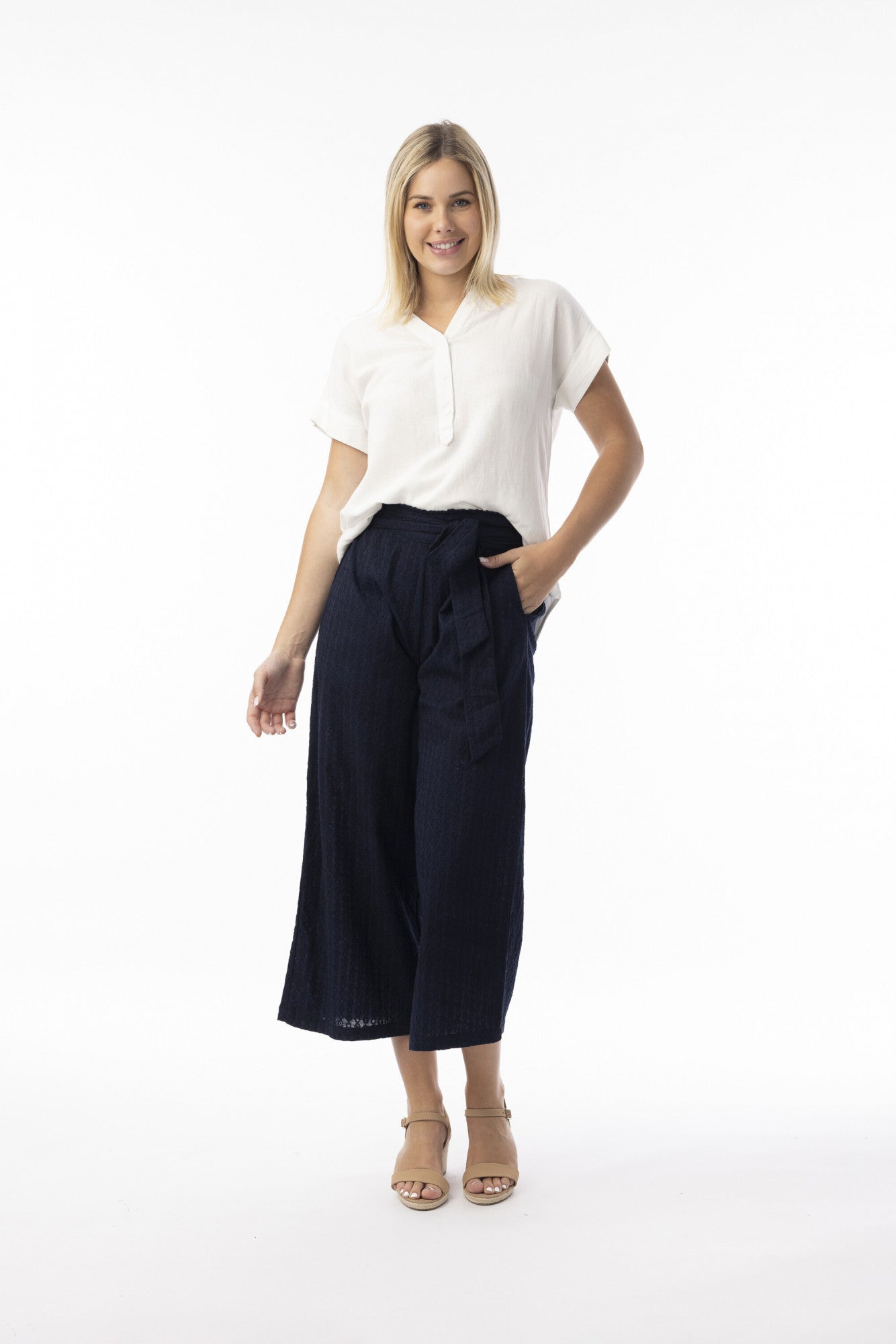 Add a touch of unique texture and charm to your summer wardrobe with our embroidered wide-leg pant. Designed in a rich, solid hue, these pants stand out with intricate all-over embroidered stitching that brings subtle depth and detail. Featuring a flattering high waist with a self-tie belt, they offer a comfortable, relaxed fit and a modern cropped length. Easy to pair with anything from a simple tee to a dressy blouse, these pants are perfect for elevating everyday style with understated elegance.