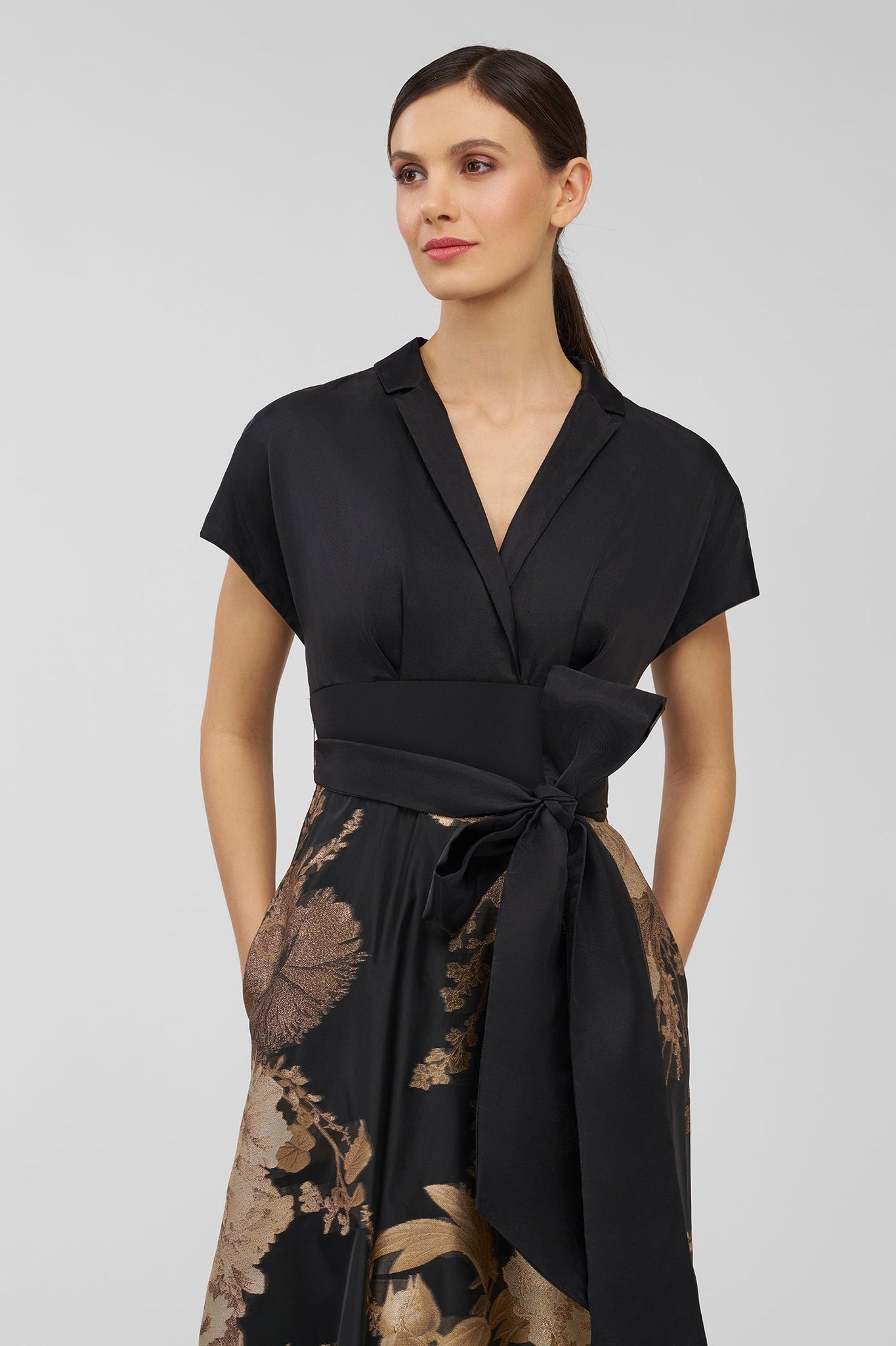 Metallic gold floral jacquard gown with a soft collar, wrap-style bodice, and dramatic sash at the waist. A modern nod to the shirt dress, reimagined for black-tie occasions.